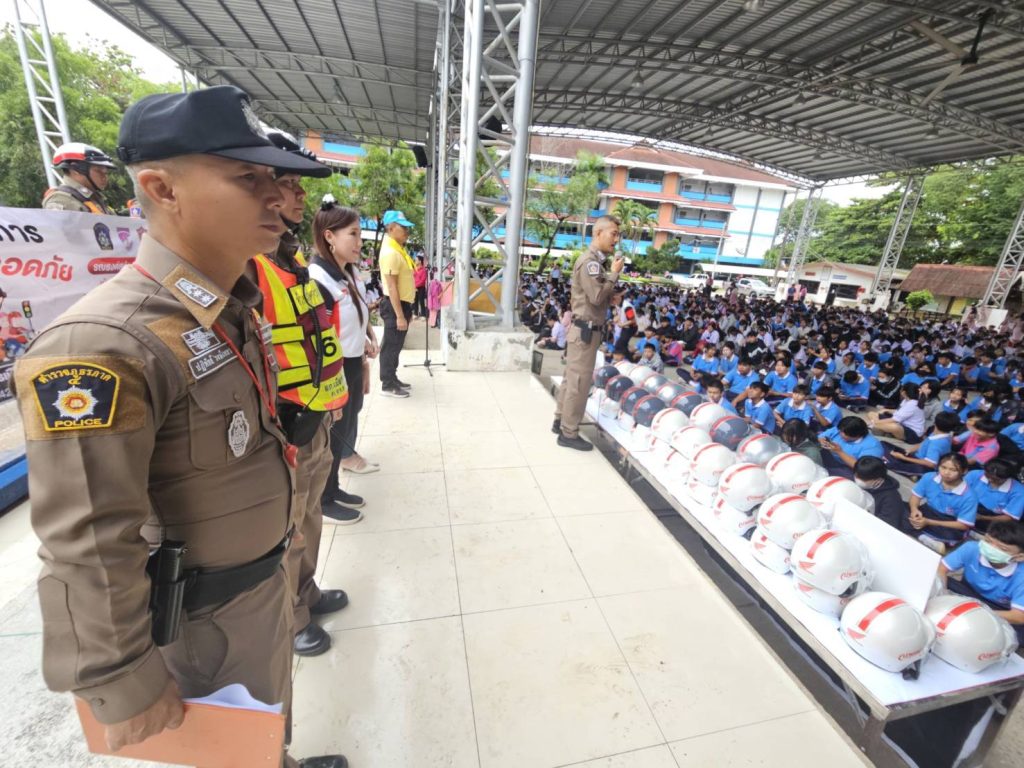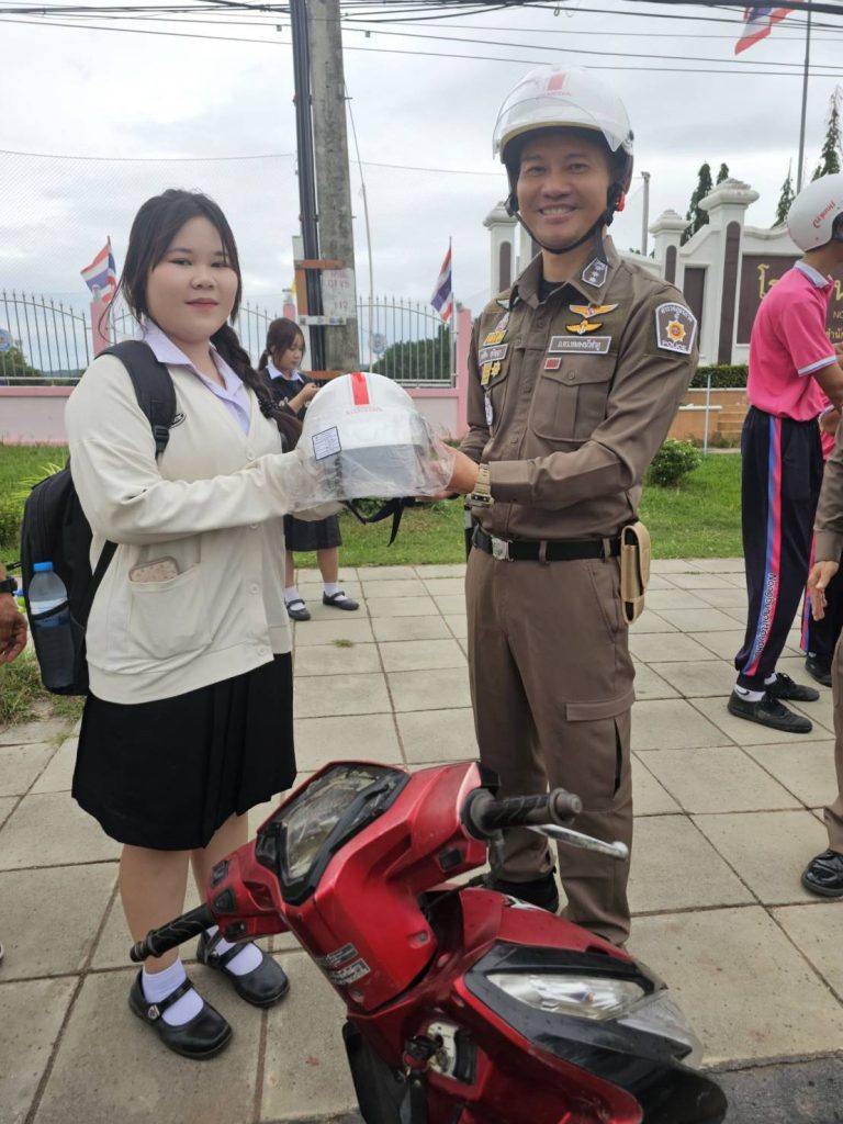 ให้ความรู้กฎหมายจราจรและการป้องกันและลดอุบัติเหตุทางถนนให้กับนักเรียน หน้าเสาธง ร.ร.หนองบัวพิทยาคาร