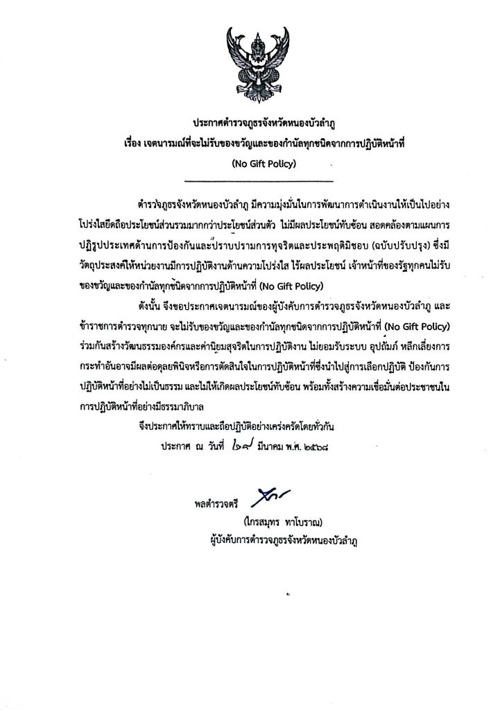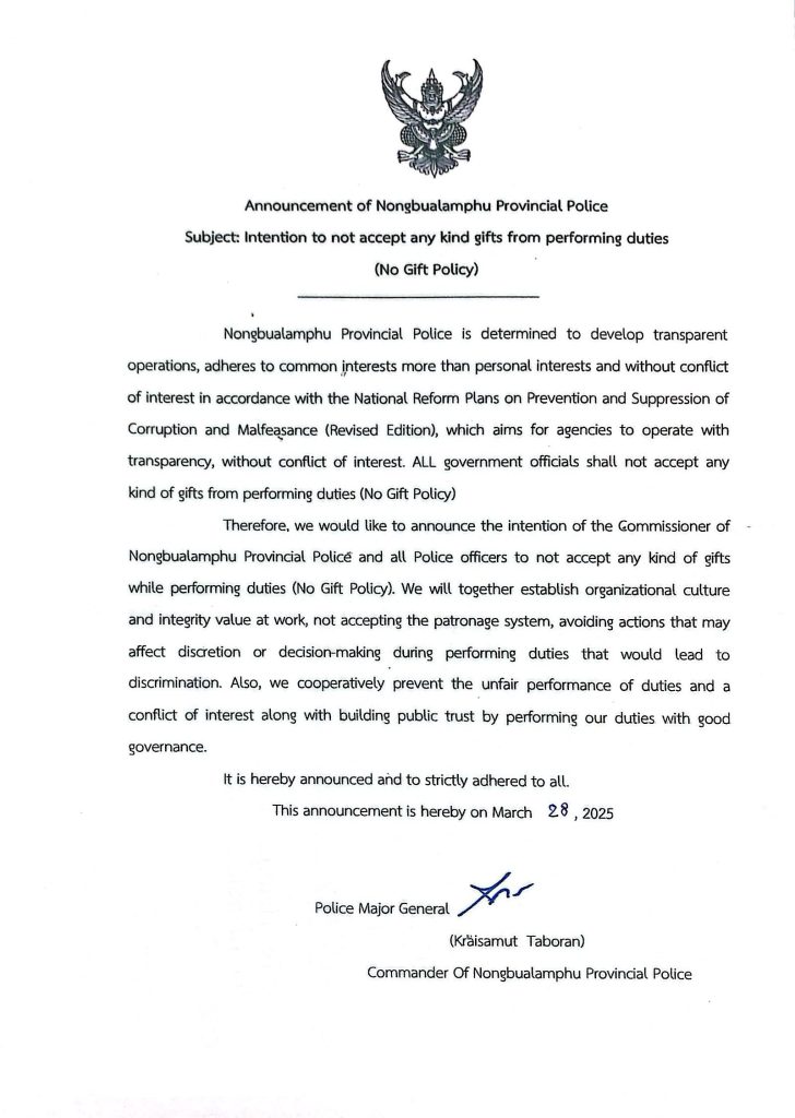 เรื่อง เจตนารมณ์ที่จะไม่รับของขวัญและของกำนัลทุกทุกชนิดจากการบัติหน้าที่