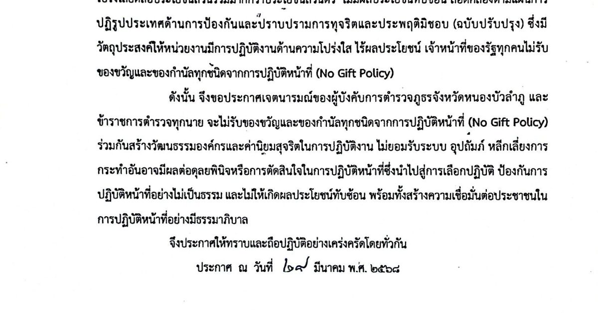 เรื่อง เจตนารมณ์ที่จะไม่รับของขวัญและของกำนัลทุกทุกชนิดจากการบัติหน้าที่