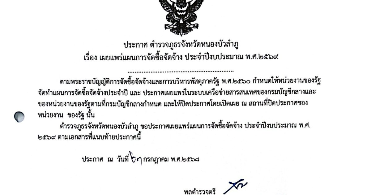 ประกาศ ตำรวจภูธรจังหวัดหนองบัวลำภู เรื่อง เผยแพร่แผนการจัดซื้อจัดจ้าง ประจำปีงบประมาณ พ.ศ.๒๕๖๙